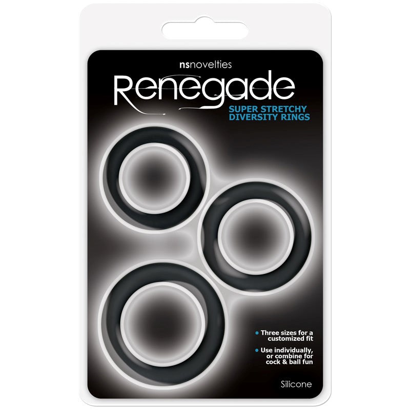 Handle the Renegade Diversity Rings, a set of three stretchy silicone rings (30mm, 35mm, 40mm) designed for enhanced intimate play and restriction sensations.